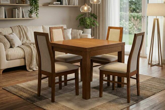 Stół "Skrzyniowo-Ramowy z nogą Rozkładaną" z okleiny dębowej + 4 krzesła Tkanina na krzesłach carabu 102 Wymiary: ...